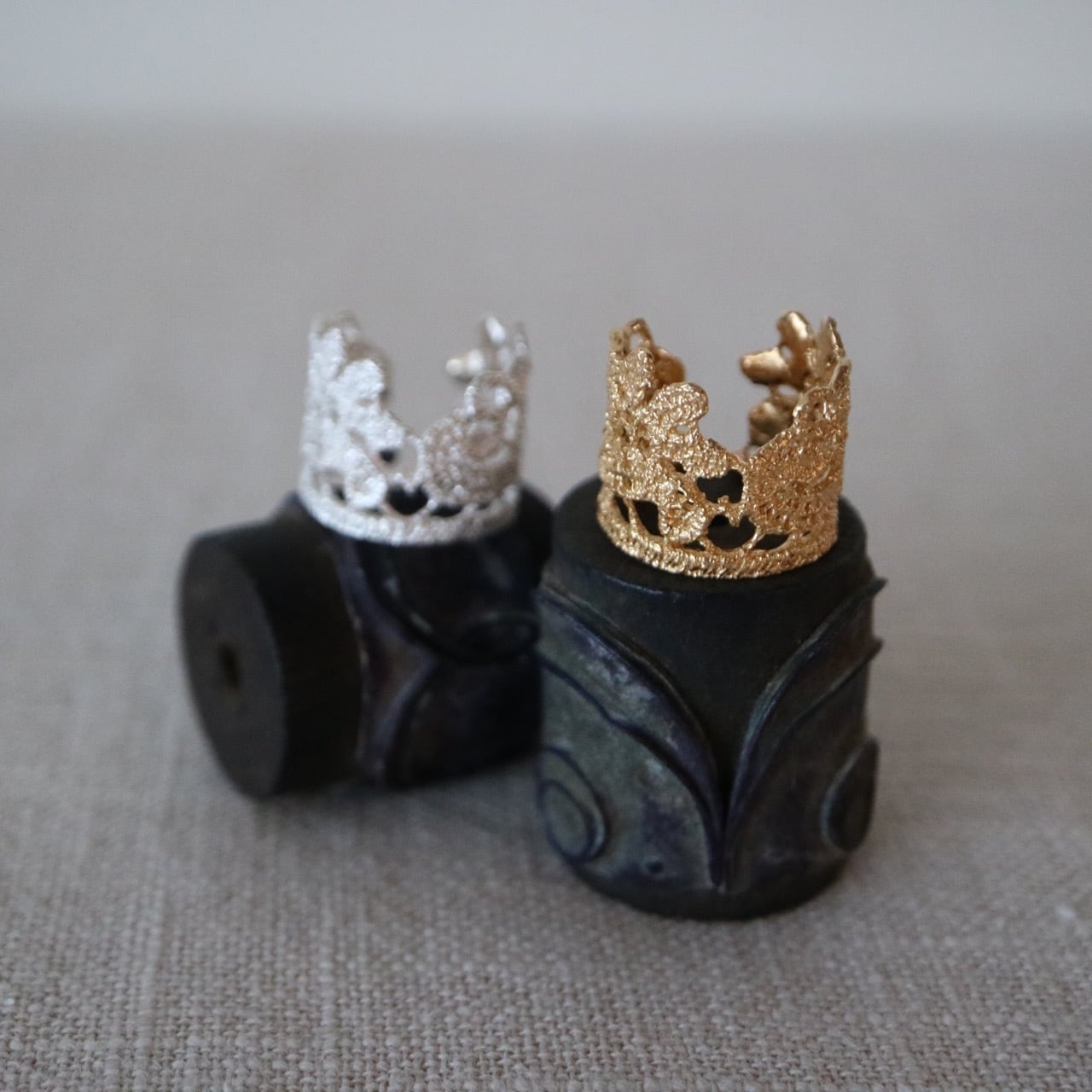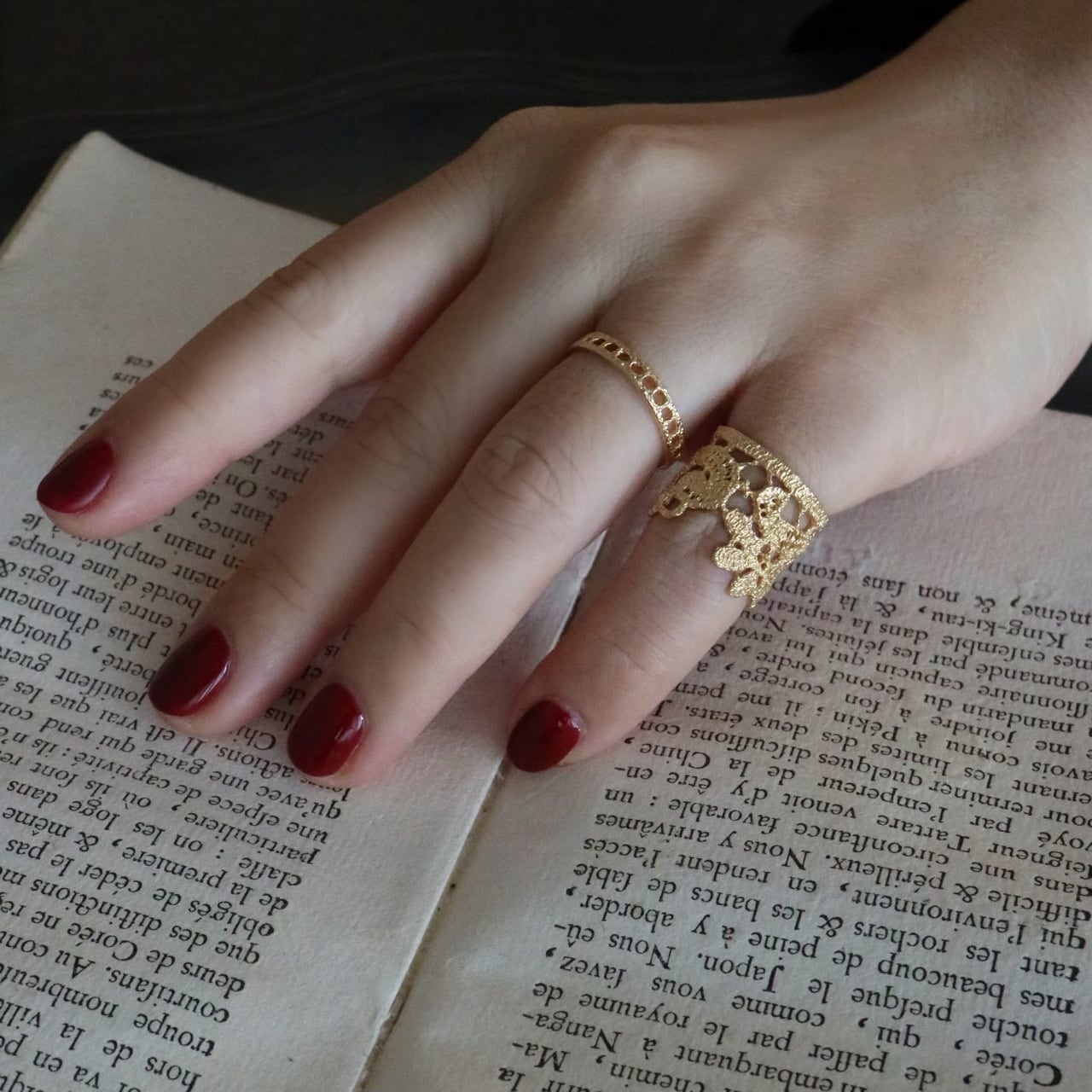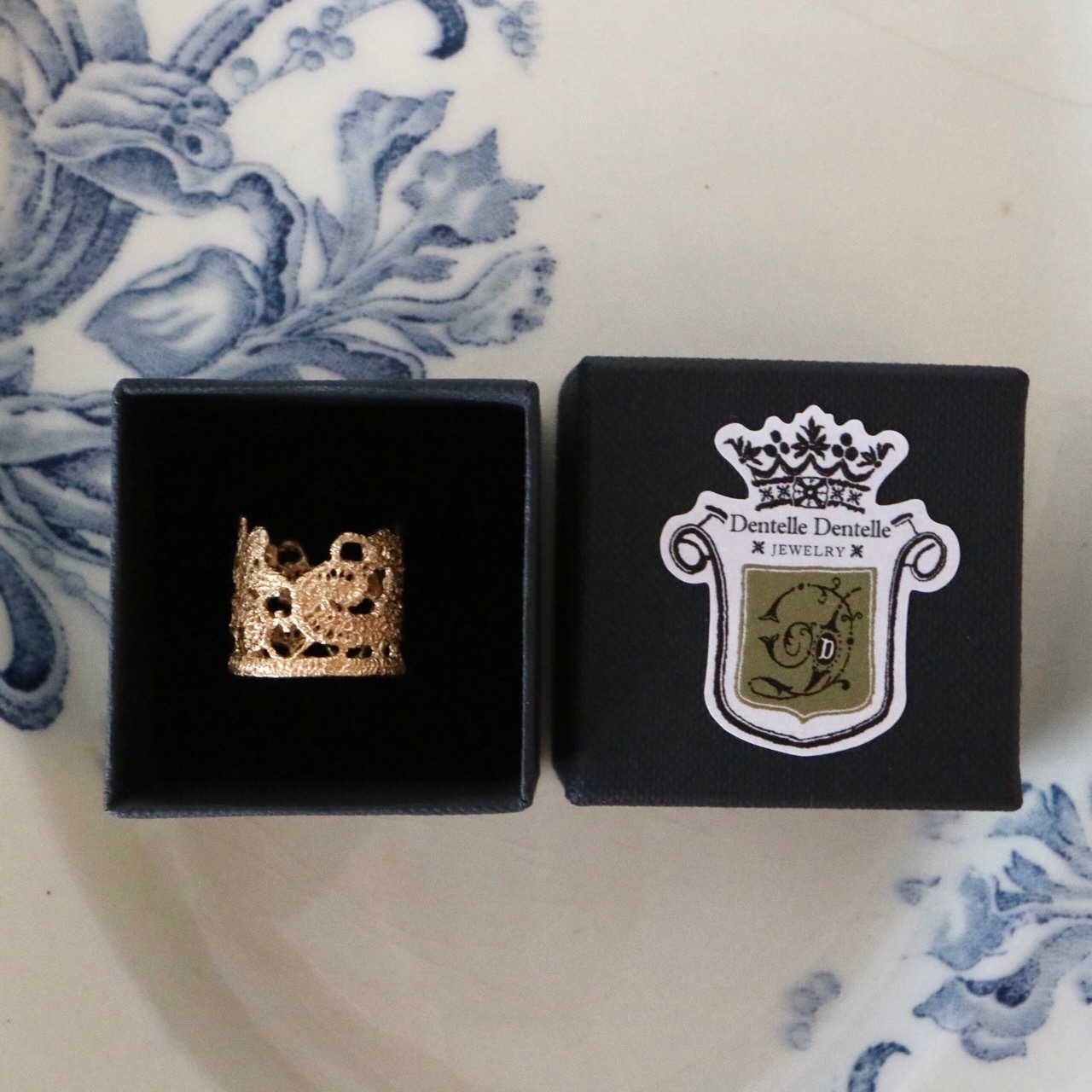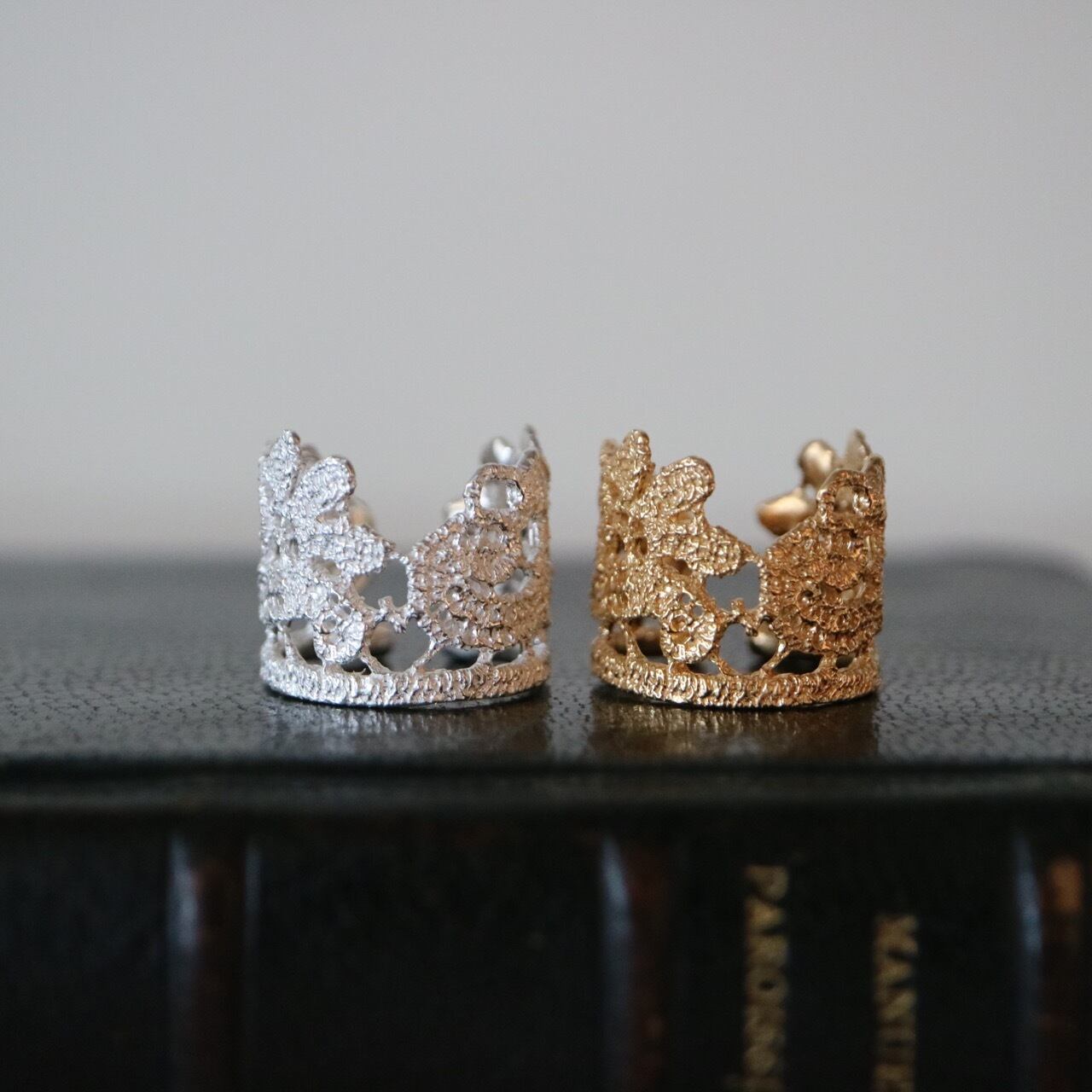 フランスのアンティークレースを「現物鋳造」という技法を用いて仕立てました。出来上がったリングは繊細な糸目も綺麗に写し取り、まるで本物のレースのよう。内側や縁を滑らかに整えていますので引っ掛かりの心配もありません。