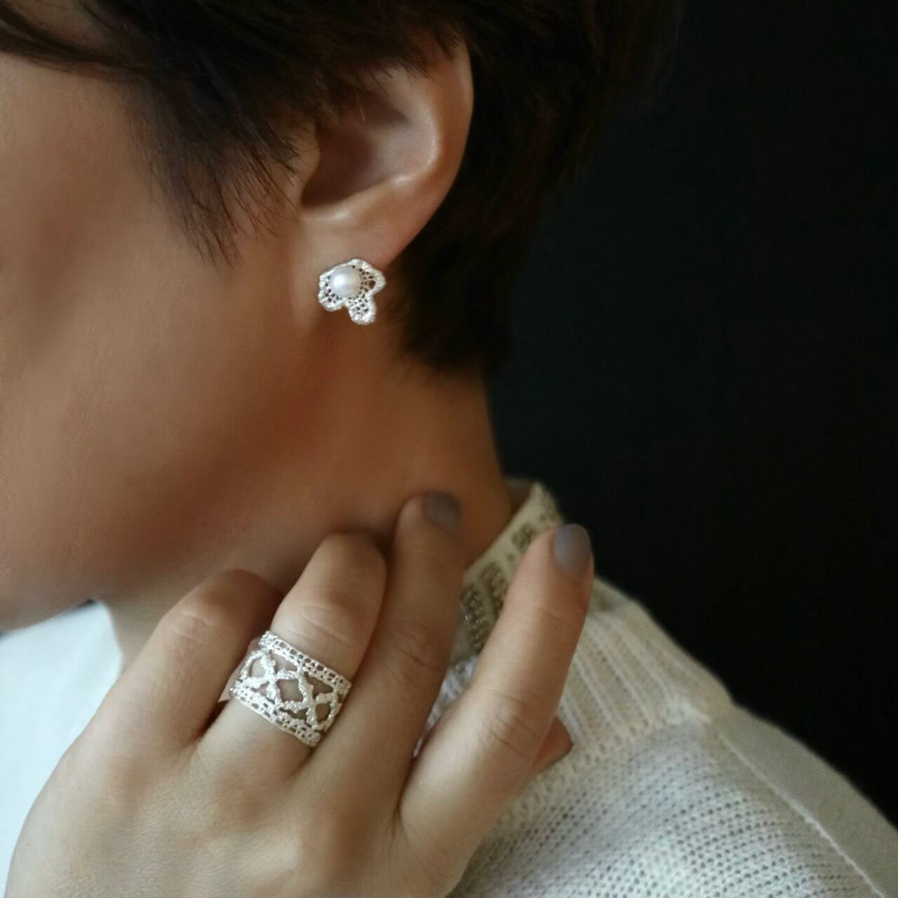 制作毎にレースを象りひとつひとつジュエリーに仕立てています。出来上がったジュエリーは繊細な糸目も綺麗に写し取り、シルバーなのにまるで本物のレースのよう。着け心地も軽やかです。鋳造の過程でレースは焼失、型を壊してジュエリーを取り出すため、希少なアンティークレースでもその型の使用は一度限りです。同じレースでも全く同じものにはならないため、個性ある作品となっています。