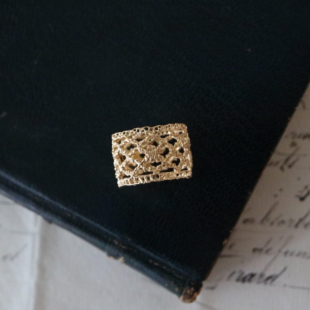 フランスのアンティークレースを「現物鋳造」という技法を用いて仕立てたリング。ブランド立ち上げ当初から作り続けていますが、作るたびに「綺麗だなぁ」と思う素敵なリングです。洋服のスタイルを選ばないので着けやすくておすすめ。作家自身も気に入って使用中です。