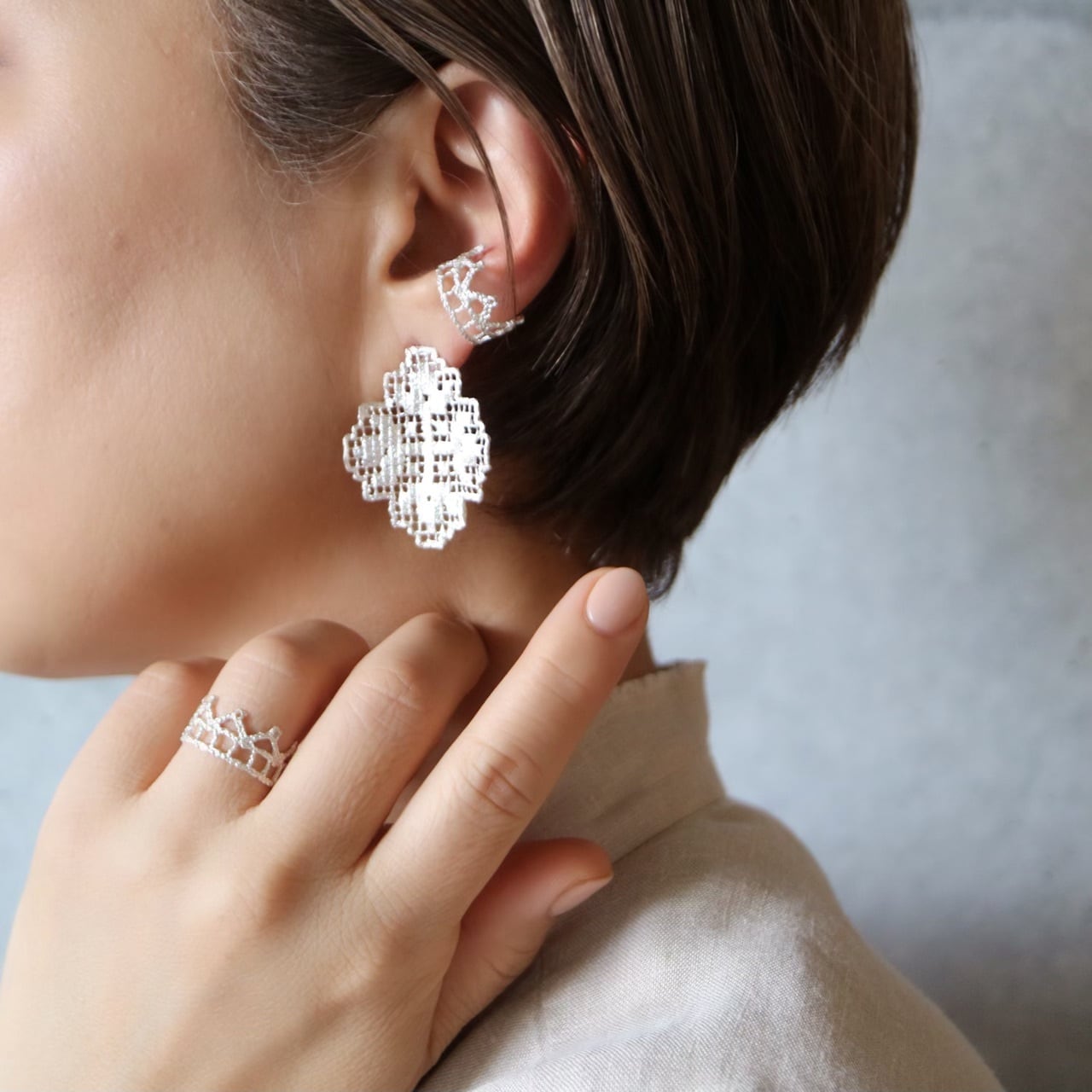制作毎にレースを象りひとつひとつジュエリーに仕立てています。出来上がったジュエリーは繊細な糸目も綺麗に写し取り、シルバーなのにまるで本物のレースのよう。着け心地も軽やかです。鋳造の過程でレースは焼失、型を壊してジュエリーを取り出すため、希少なアンティークレースでもその型の使用は一度限り。同じレースでも全く同じものにはならないため、個性ある作品となっています。
