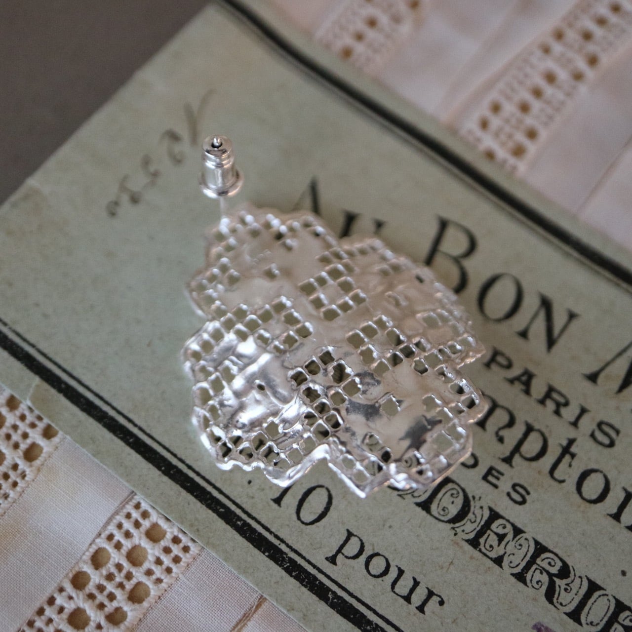 フランスのアンティークレースを「現物鋳造」という技法を用いて仕立てた片耳用のシングルピアスです。