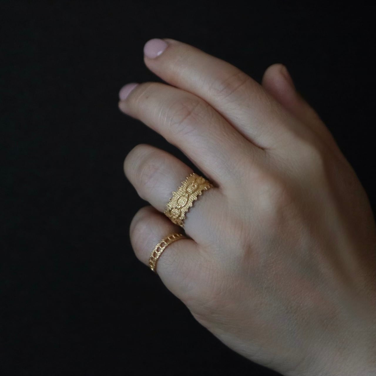 フランスのアンティークレースを「現物鋳造」という技法を用いて仕立てました。出来上がったリングは繊細な糸目も綺麗に写し取り、まるで本物のレースのよう。内側や縁を滑らかに整えていますので引っ掛かりの心配もありません。