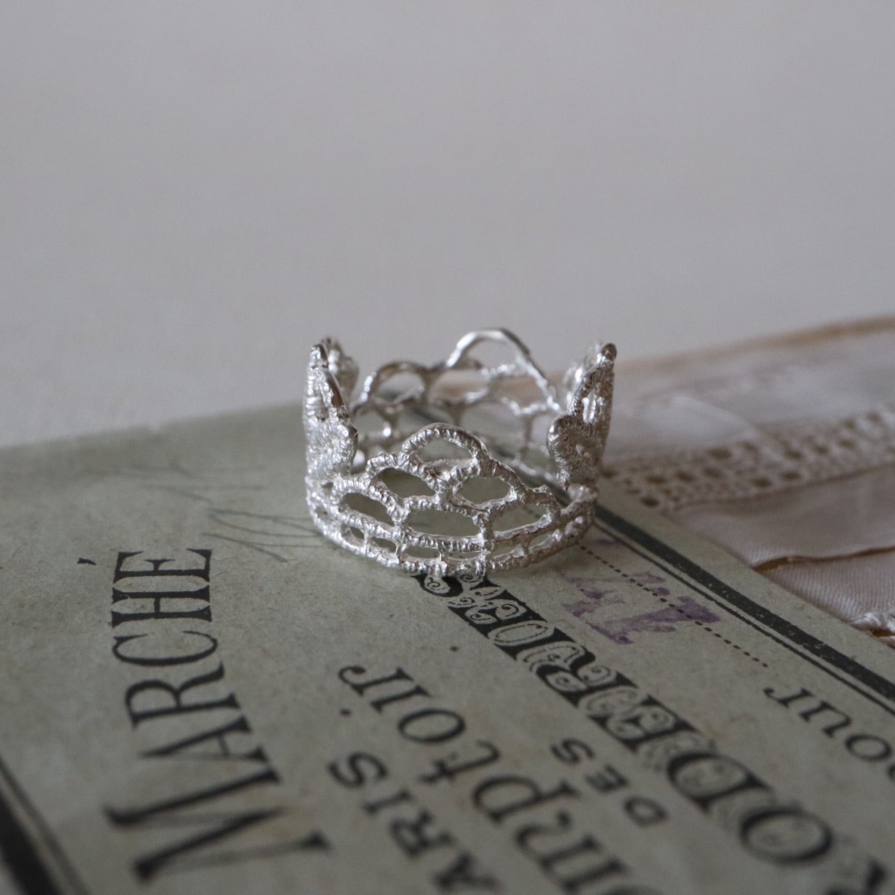 フランスのアンティークレースを「現物鋳造」という技法を用いて仕立てました。出来上がったリングは繊細な糸目も綺麗に写し取り、まるで本物のレースのよう。内側や縁を滑らかに整えていますので引っ掛かりの心配もありません。