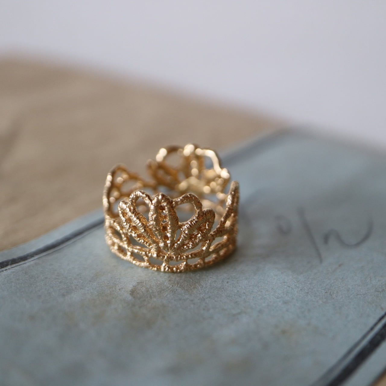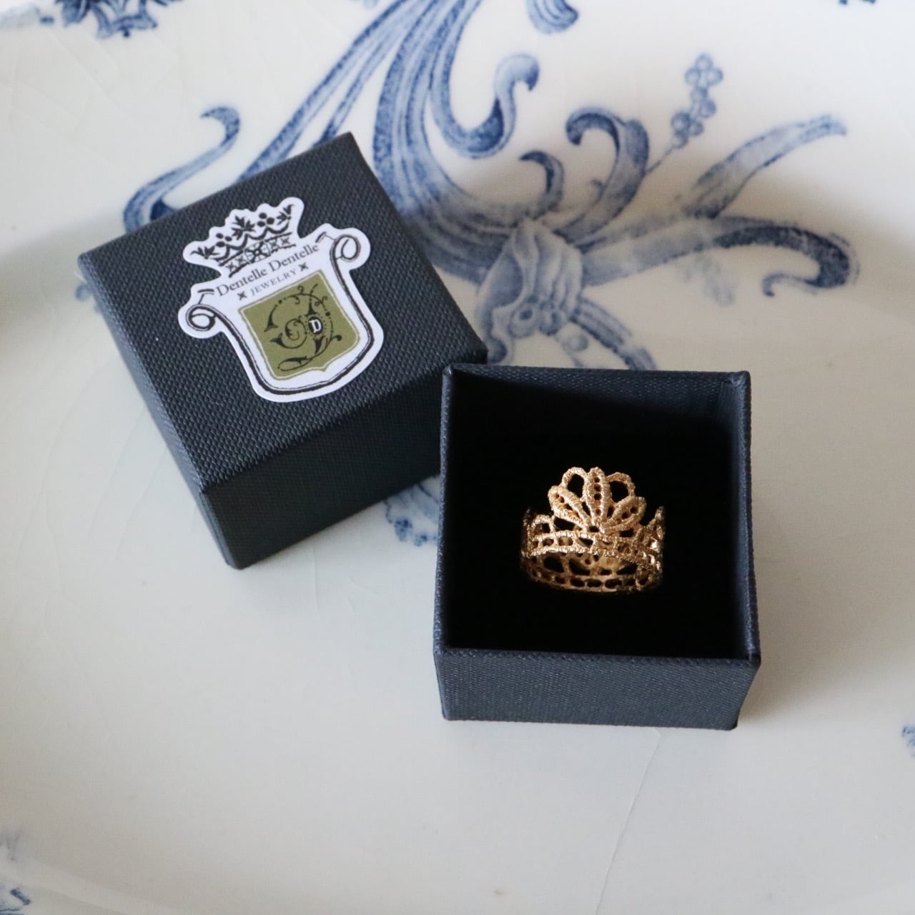 フランスのアンティークレースを「現物鋳造」という技法を用いて仕立てました。出来上がったリングは繊細な糸目も綺麗に写し取り、まるで本物のレースのよう。内側や縁を滑らかに整えていますので引っ掛かりの心配もありません。