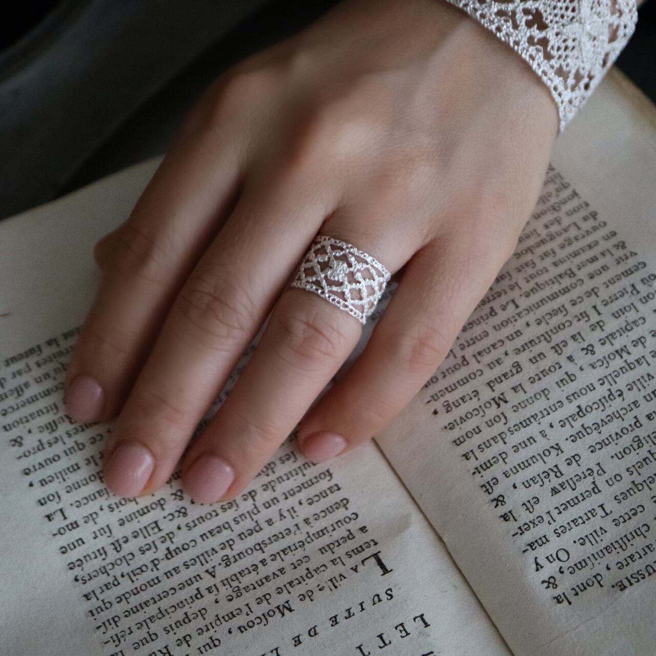 フランスのアンティークレースを「現物鋳造」という技法を用いて仕立てたリング。ブランド立ち上げ当初から作り続けていますが、作るたびに「綺麗だなぁ」と思う素敵なリングです。洋服のスタイルを選ばないので着けやすくておすすめ。作家自身も気に入って使用中です。
