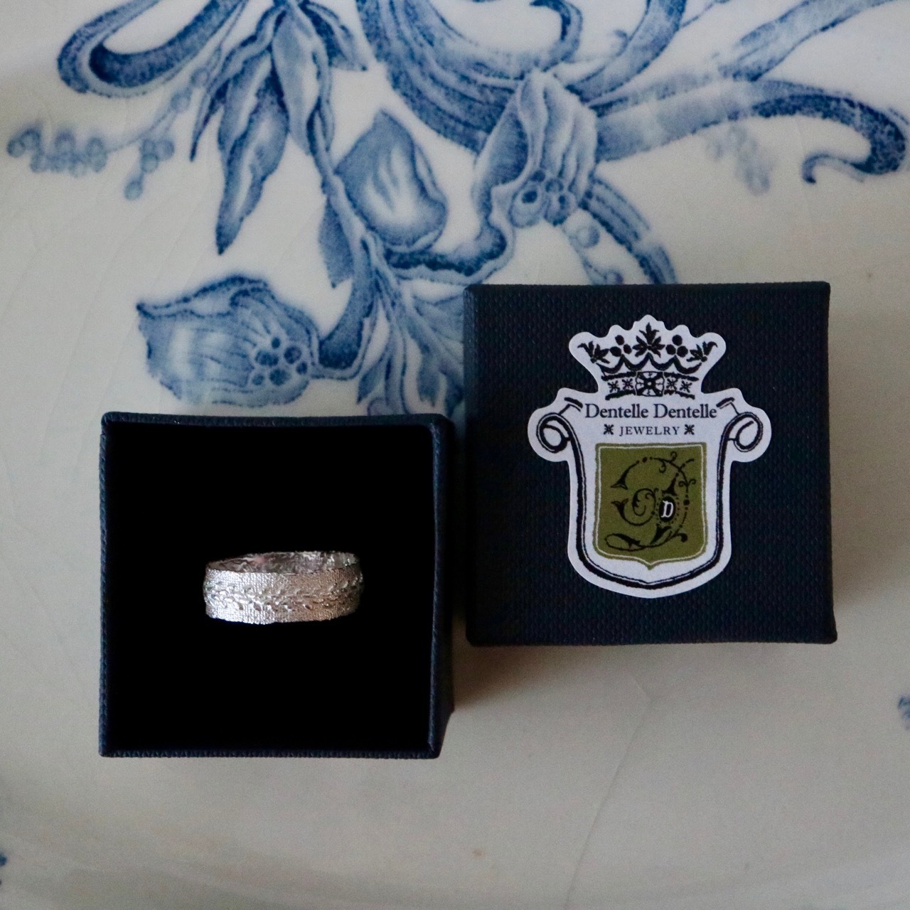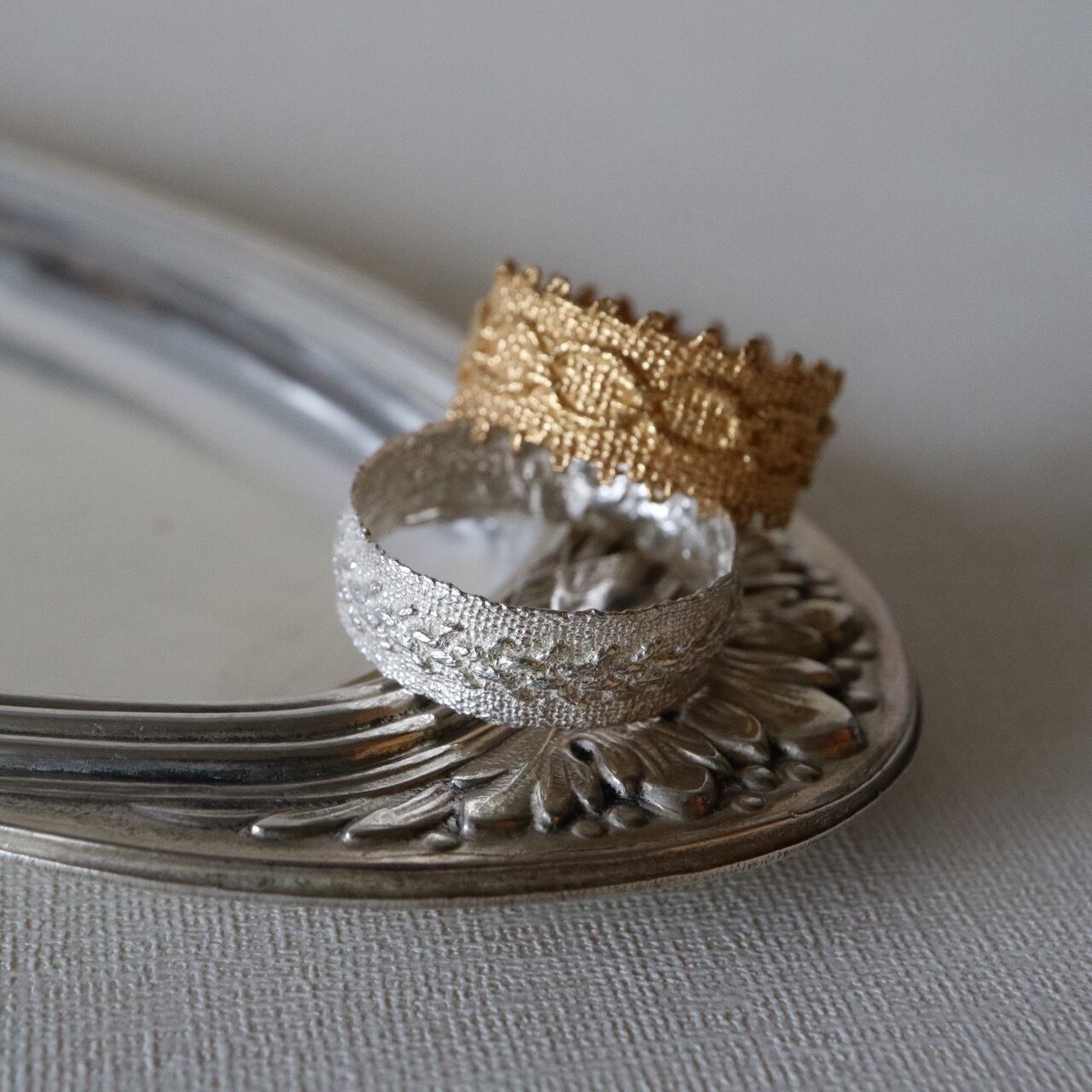 フランスのアンティークレースを「現物鋳造」という技法を用いて仕立てたリング。こちらはレースというより刺繡の入ったコードをリングにしています。刺繍が植物の葉を思わせるのでナチュラルな雰囲気。重ね付けにもおすすめです。