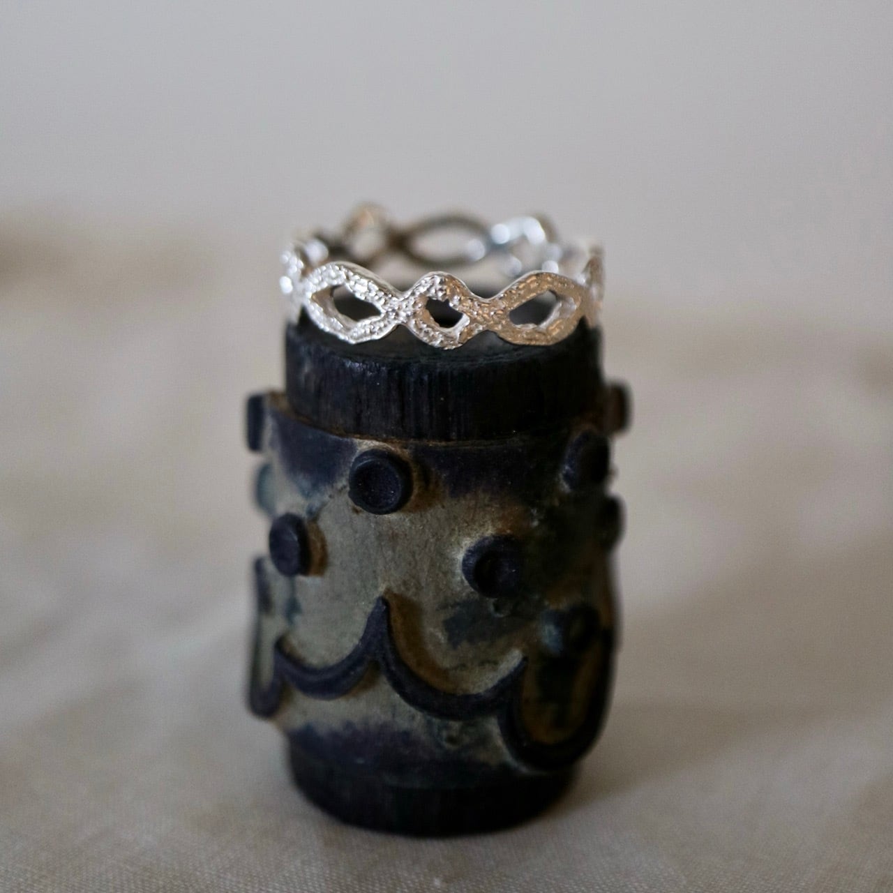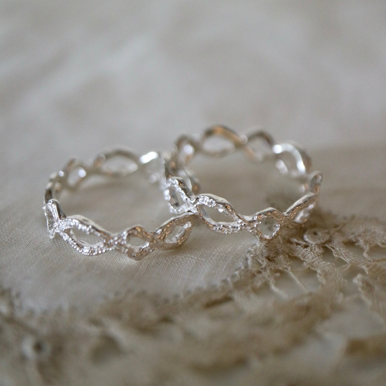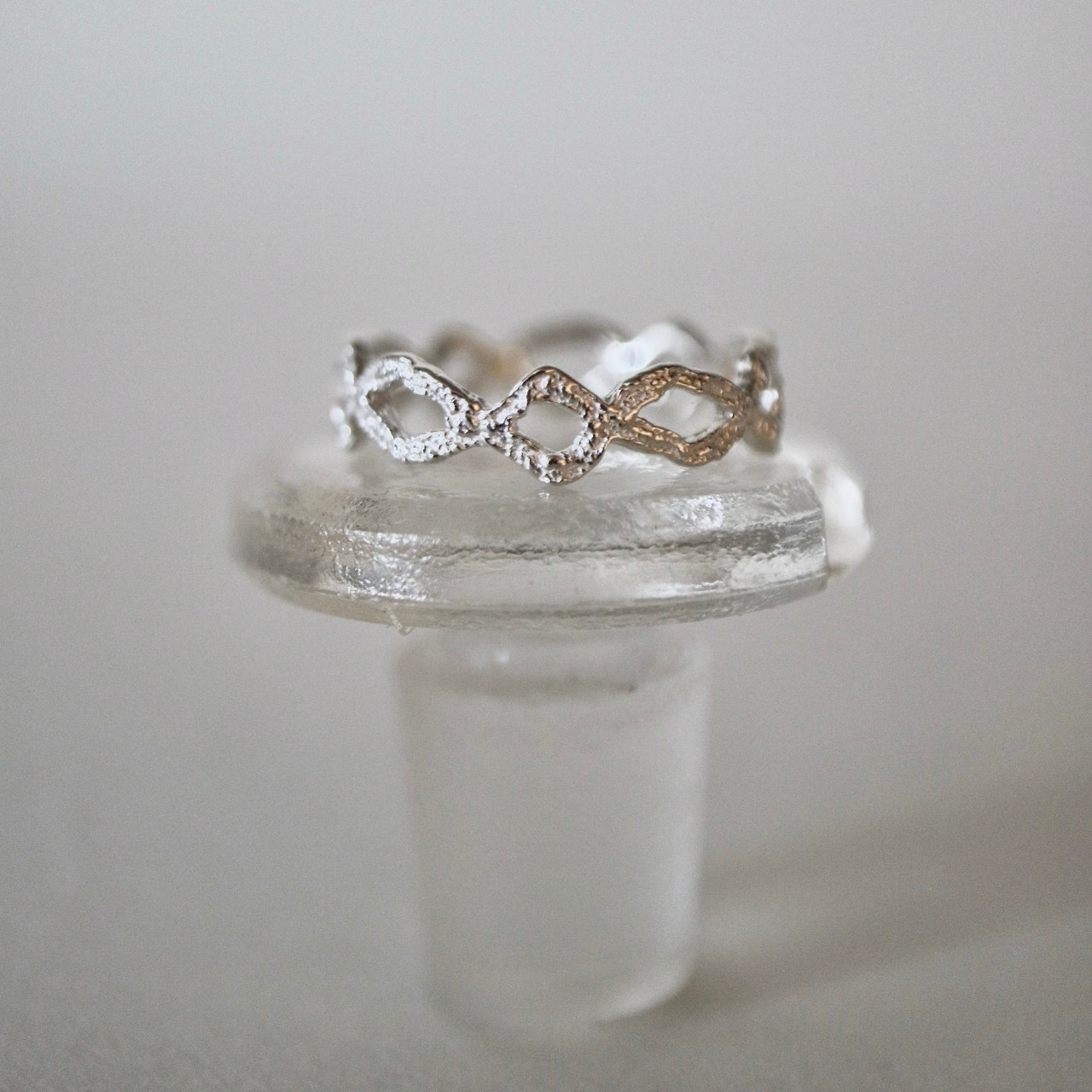 フランスのアンティークレースを「現物鋳造」という技法を用いて仕立てたリング。華奢で軽く、重ね付けしやすいので人気のリングです。改良を重ね華奢なデザインはそのままに、以前に比べて厚みを持たせています。内側は滑らかに整えていますので着け心地も更に良くなりました。