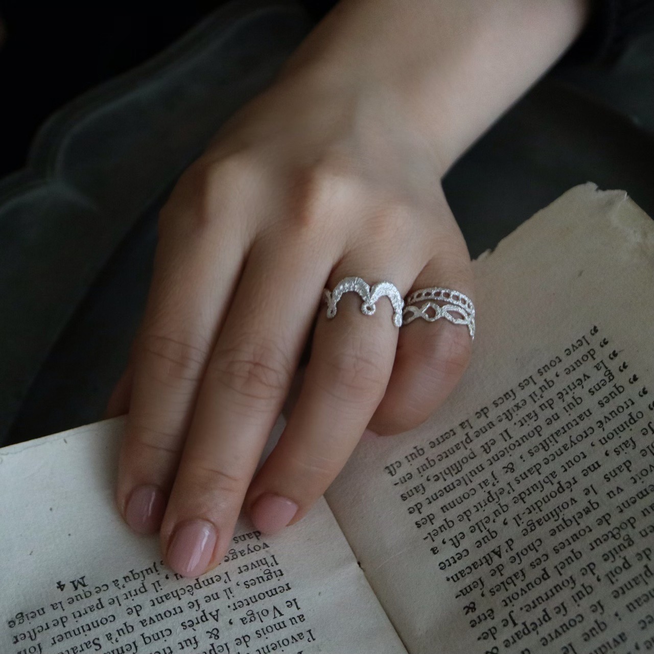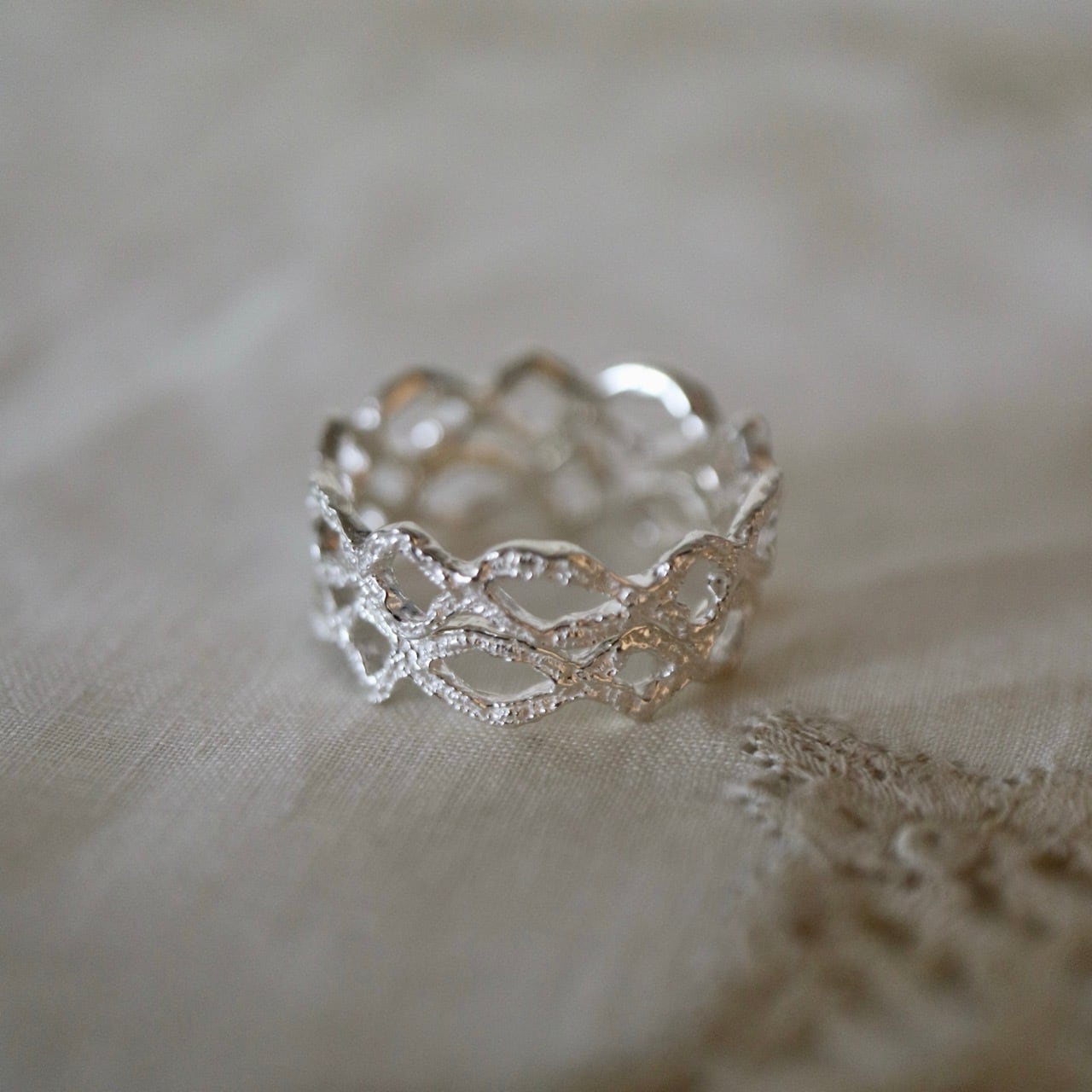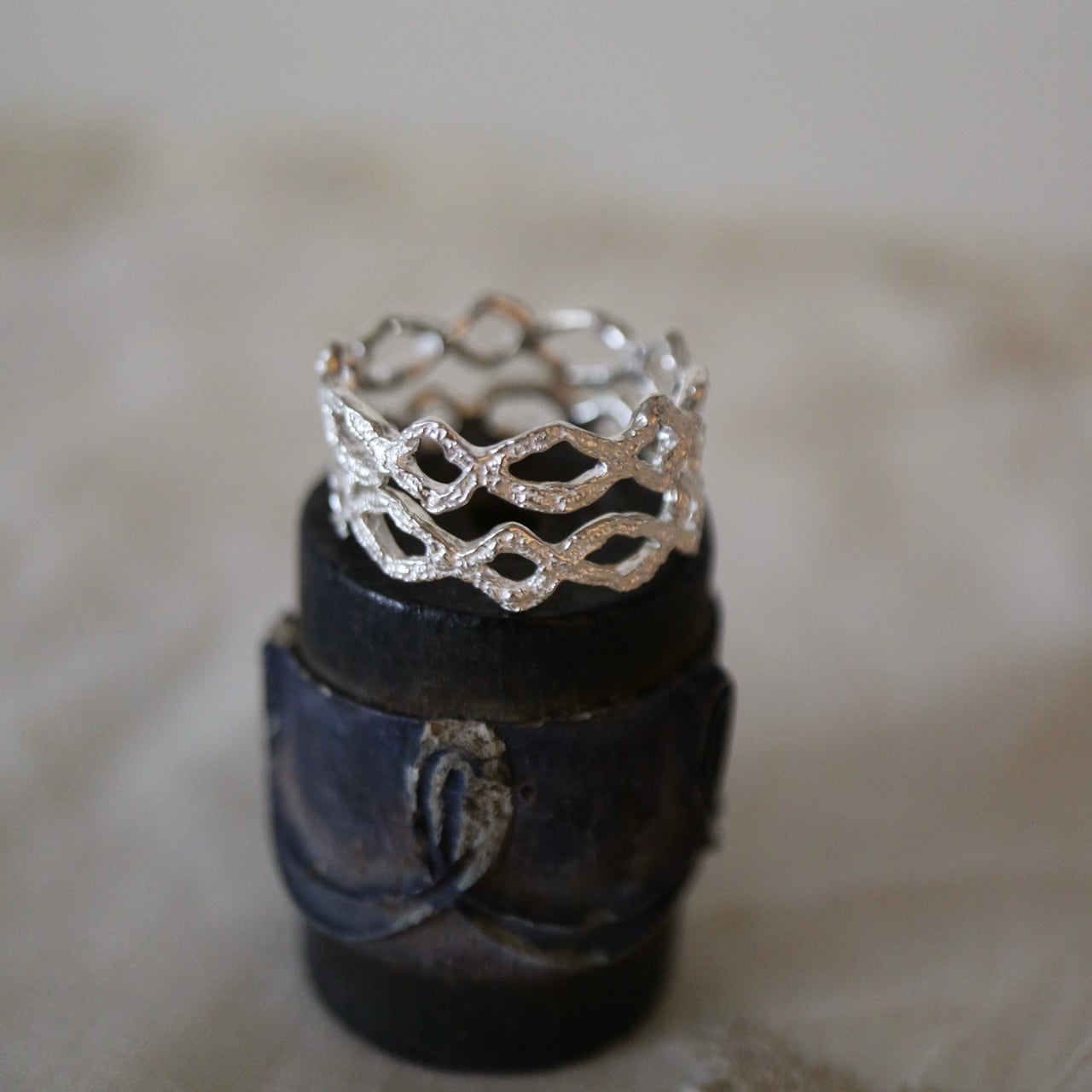 フランスのアンティークレースを「現物鋳造」という技法を用いて仕立てたリング。華奢で軽く、重ね付けしやすいので人気のリングです。改良を重ね華奢なデザインはそのままに、以前に比べて厚みを持たせています。内側は滑らかに整えていますので着け心地も更に良くなりました。