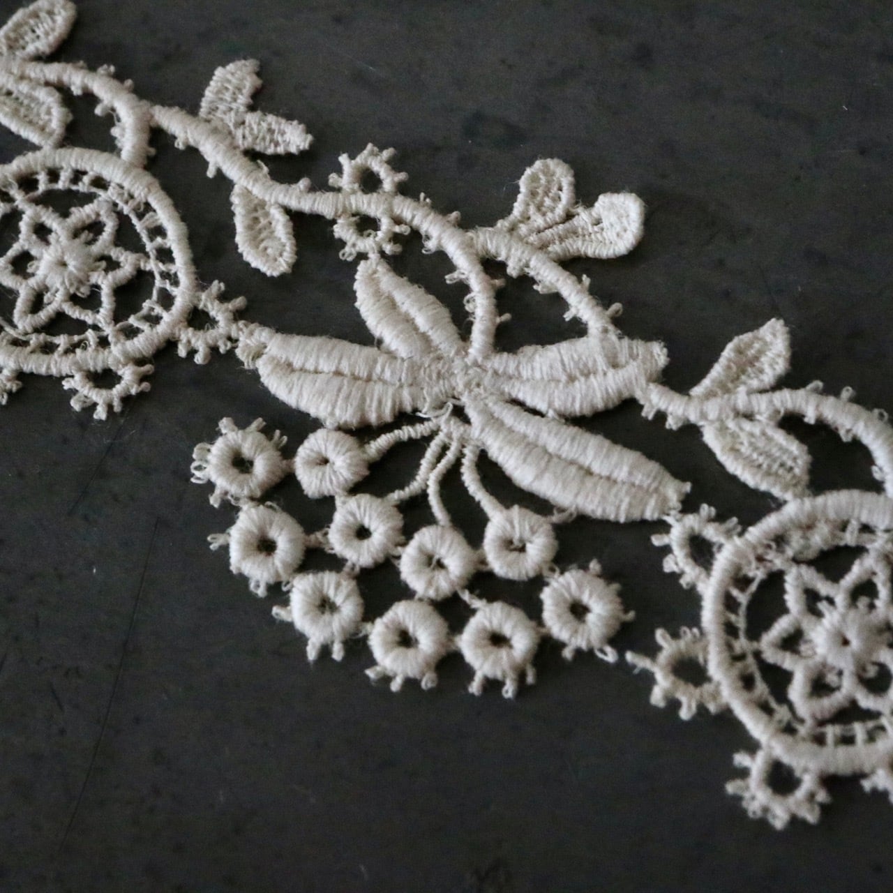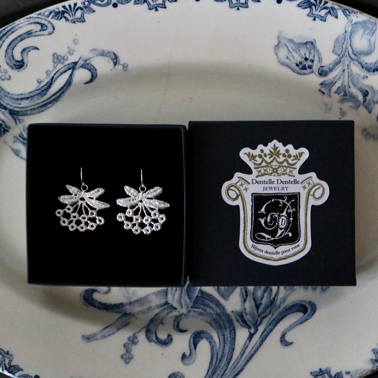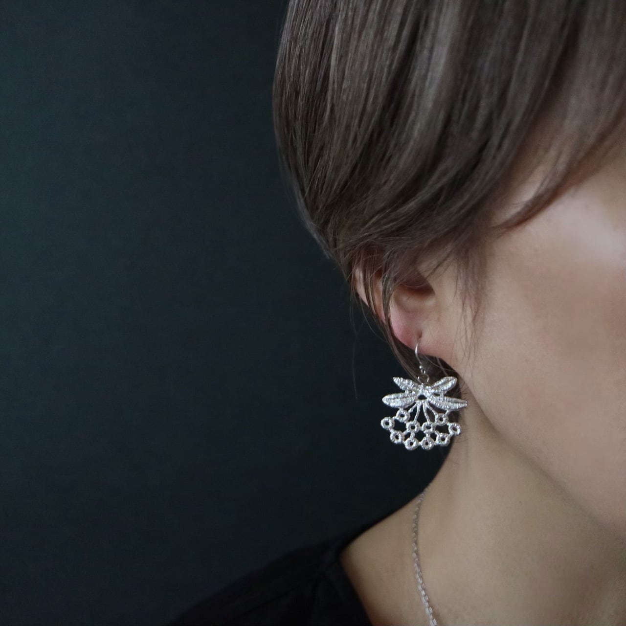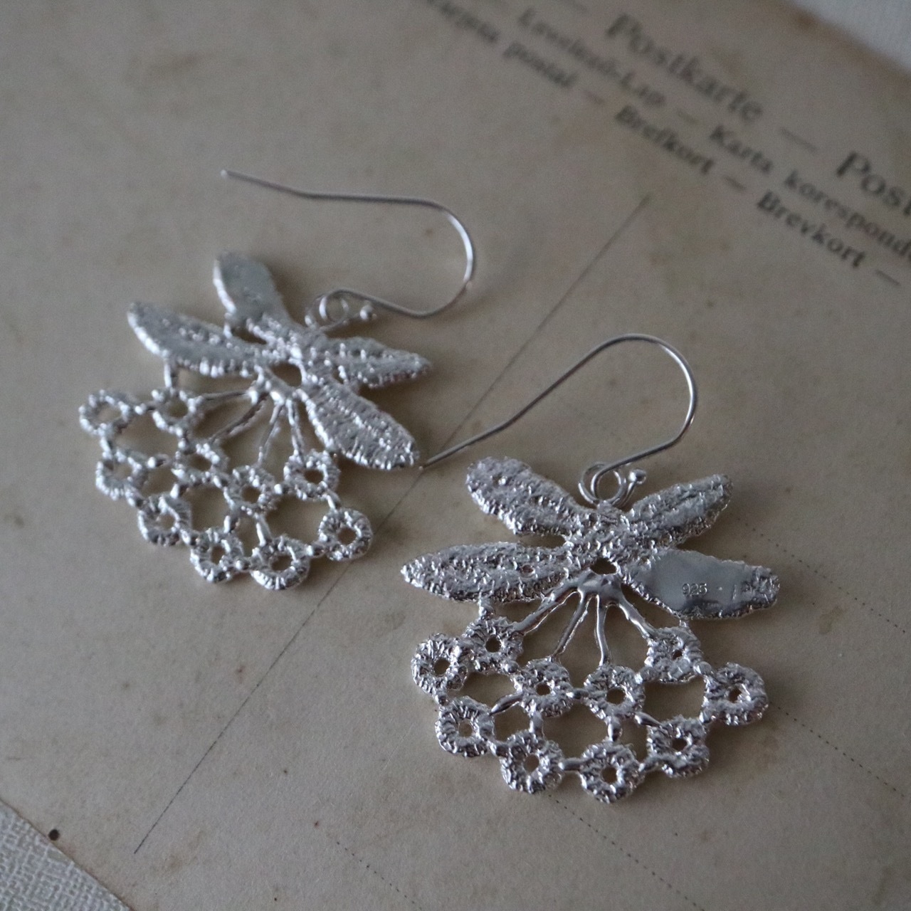 制作毎にレースを象りひとつひとつジュエリーに仕立てています。出来上がったジュエリーは繊細な糸目も綺麗に写し取り、シルバーなのにまるで本物のレースのよう。着け心地も軽やかです。鋳造の過程でレースは焼失、型を壊してジュエリーを取り出すため、希少なアンティークレースでもその型の使用は一度限り。同じレースでも全く同じものにはならないため、個性ある作品となっています。