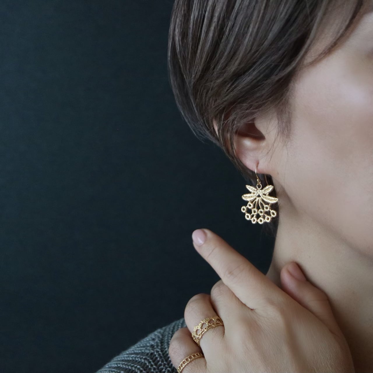 制作毎にレースを象りひとつひとつジュエリーに仕立てています。出来上がったジュエリーは繊細な糸目も綺麗に写し取り、シルバーなのにまるで本物のレースのよう。着け心地も軽やかです。鋳造の過程でレースは焼失、型を壊してジュエリーを取り出すため、希少なアンティークレースでもその型の使用は一度限り。同じレースでも全く同じものにはならないため、個性ある作品となっています。
