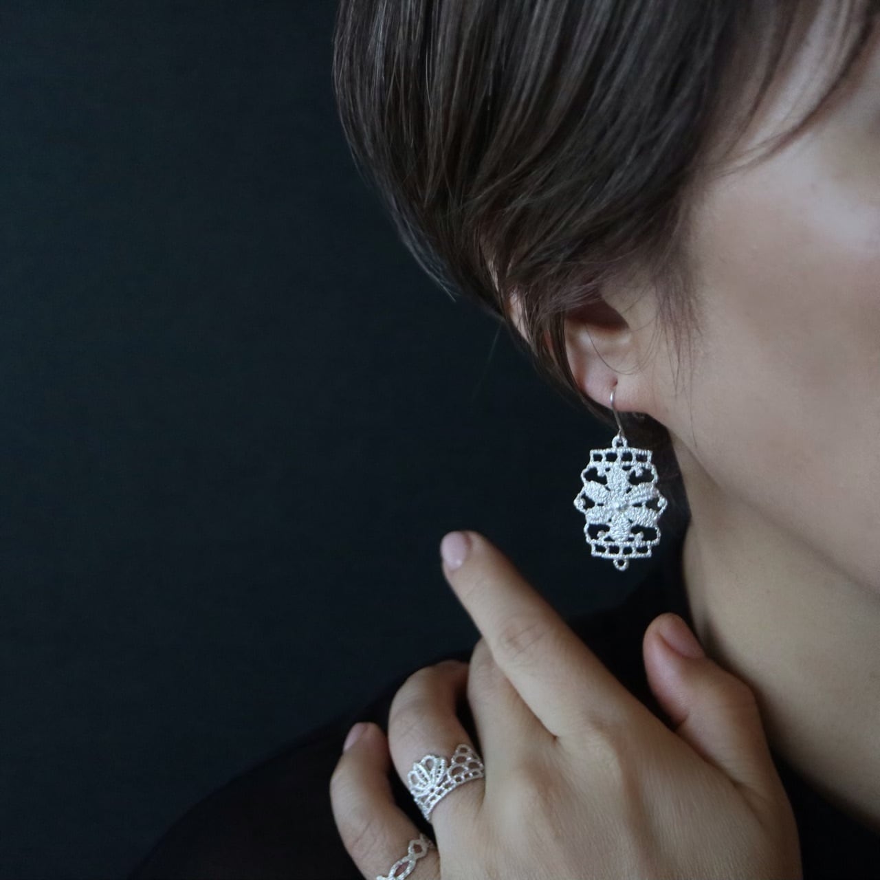 制作毎にレースを象りひとつひとつジュエリーに仕立てています。出来上がったジュエリーは繊細な糸目も綺麗に写し取り、シルバーなのにまるで本物のレースのよう。着け心地も軽やかです。鋳造の過程でレースは焼失、型を壊してジュエリーを取り出すため、希少なアンティークレースでもその型の使用は一度限り。同じレースでも全く同じものにはならないため、個性ある作品となっています。