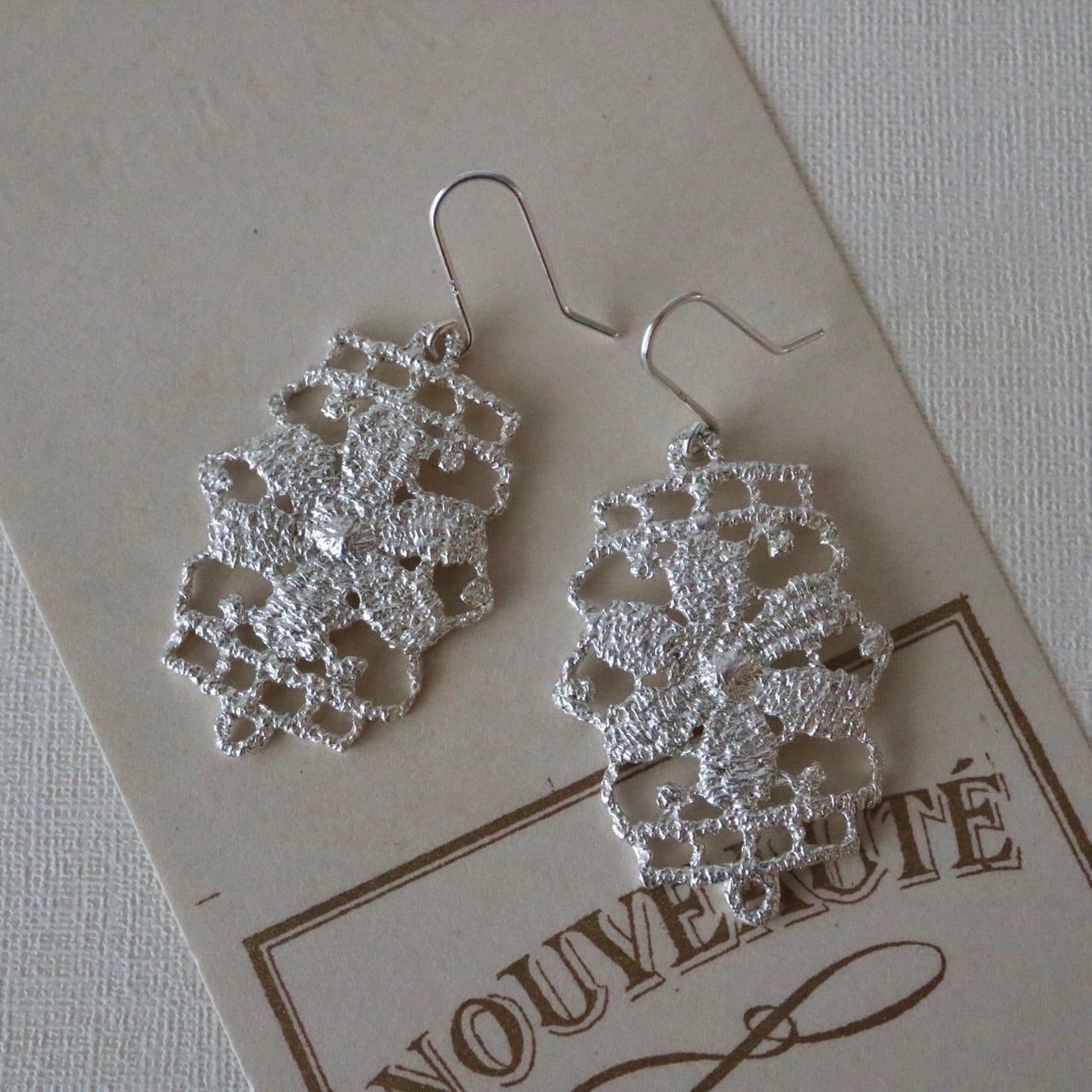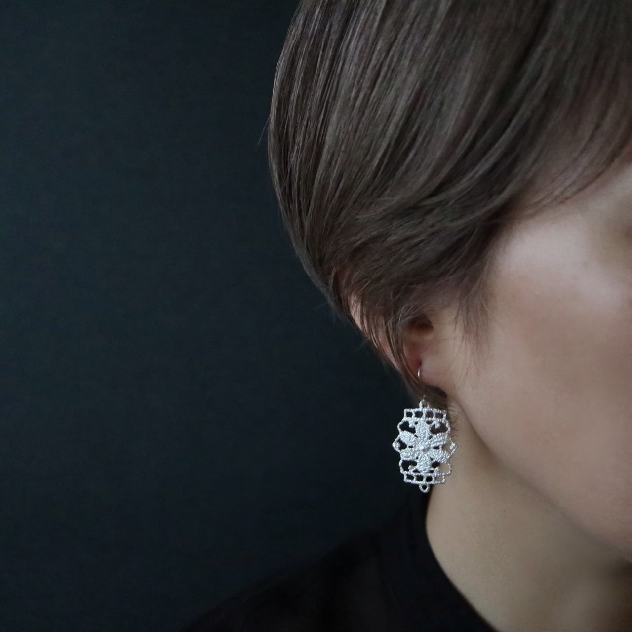 フランスのアンティークレースを「現物鋳造」という技法を用いて仕立てたピアス。花のモチーフですが形状が縦長だからか着けてみると少し辛口の印象もあります。