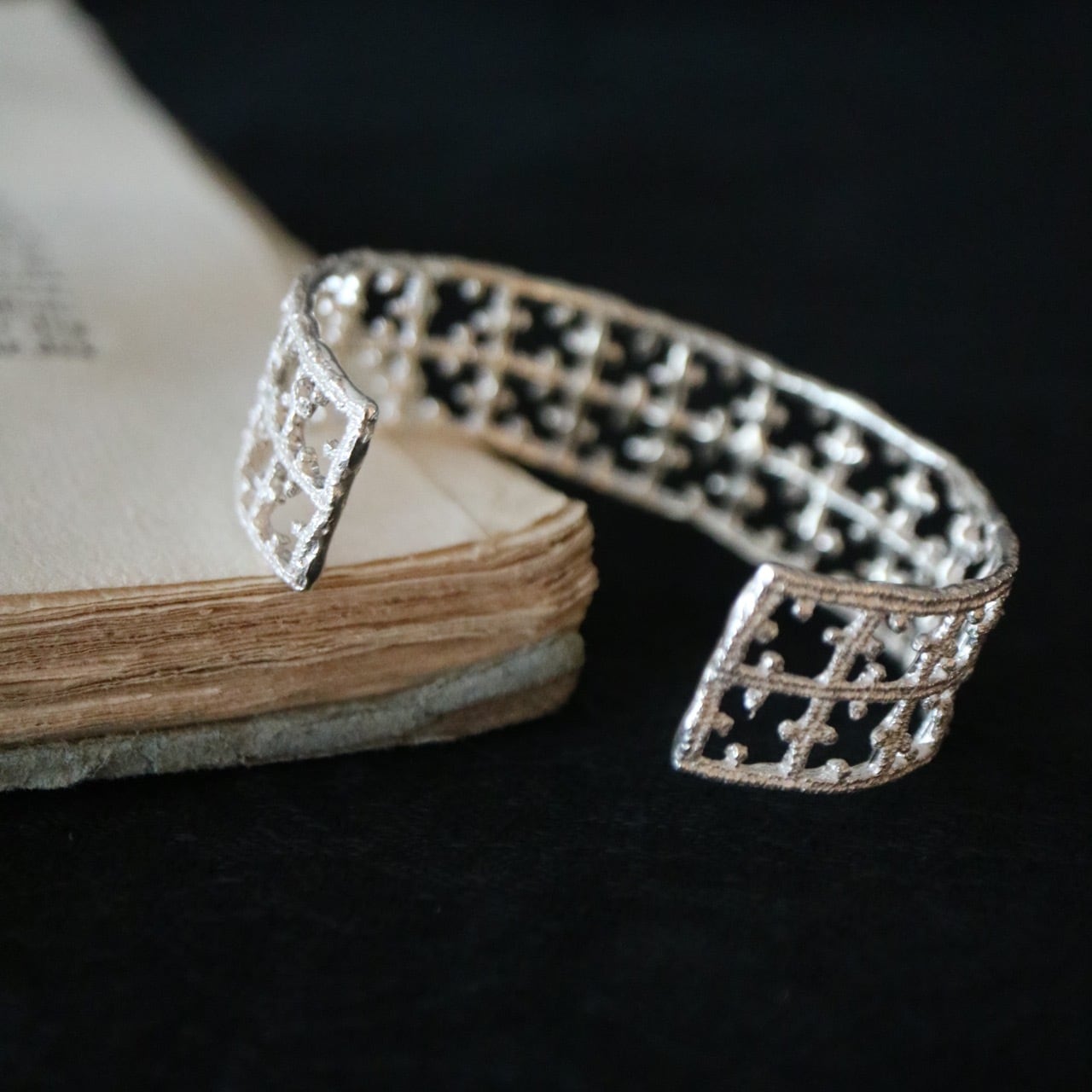 フランスのアンティークレースを「現物鋳造」という技法を用いて仕立てたバングル。近くで見ると四角と小さな丸い粒が規則的に並んだ柄ですが、離れるとアラベスク紋様のようにも見えてきます。画像10枚目のように重ね付けしても素敵。