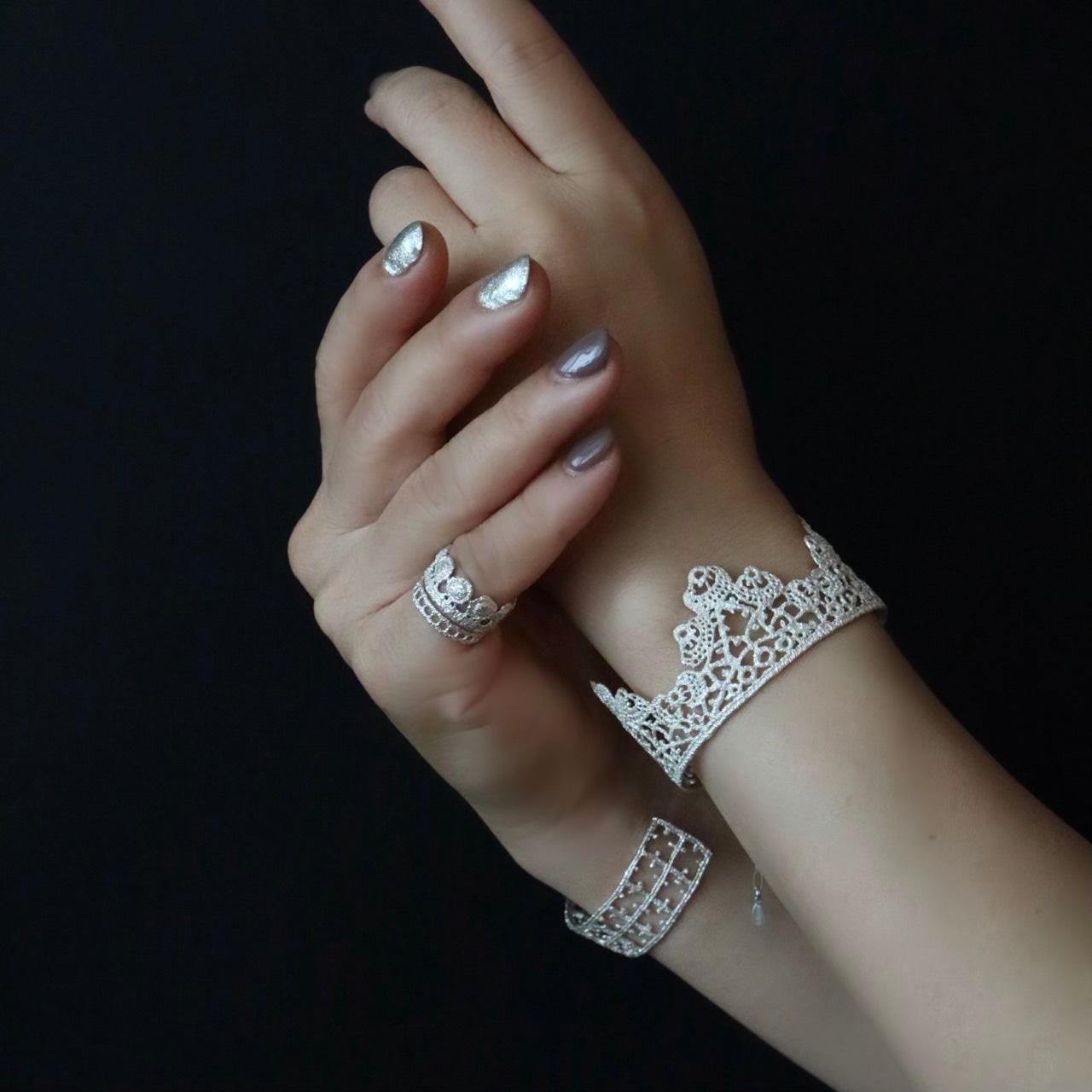 制作毎にレースを象りひとつひとつジュエリーに仕立てています。出来上がったジュエリーは繊細な糸目も綺麗に写し取り、シルバーなのにまるで本物のレースのよう。着け心地も軽やかです。鋳造の過程でレースは焼失、型を壊してジュエリーを取り出すため、希少なアンティークレースでもその型の使用は一度限り。同じレースでも全く同じものにはならないため、個性ある作品となっています。