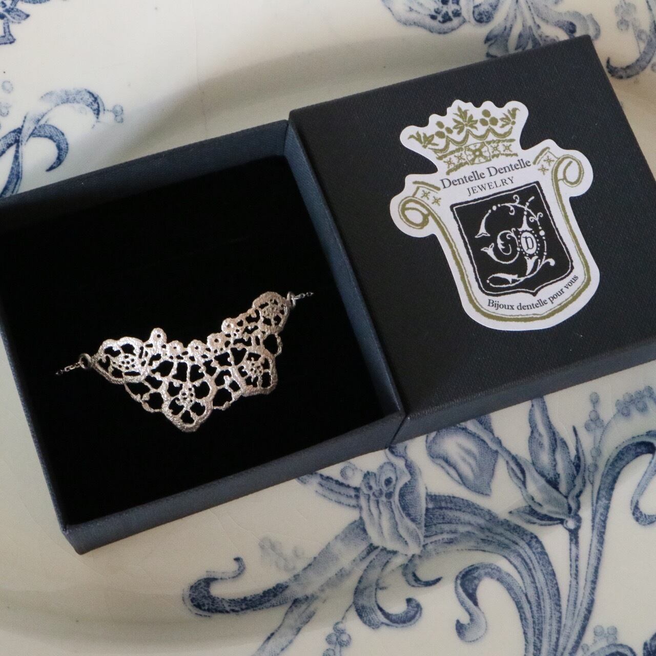 とても繊細なギピュールレースからこの模様を切り取りブレスレットに。アールヌーヴォー様式の蝶を思わせるデザインとなりました。