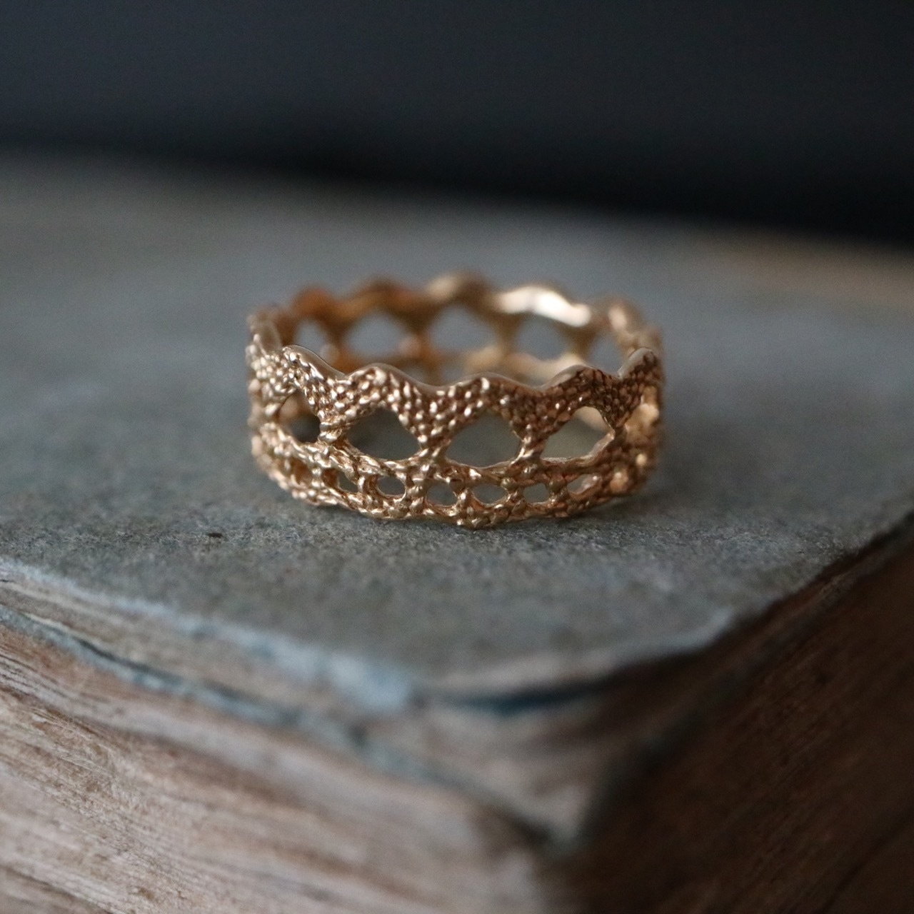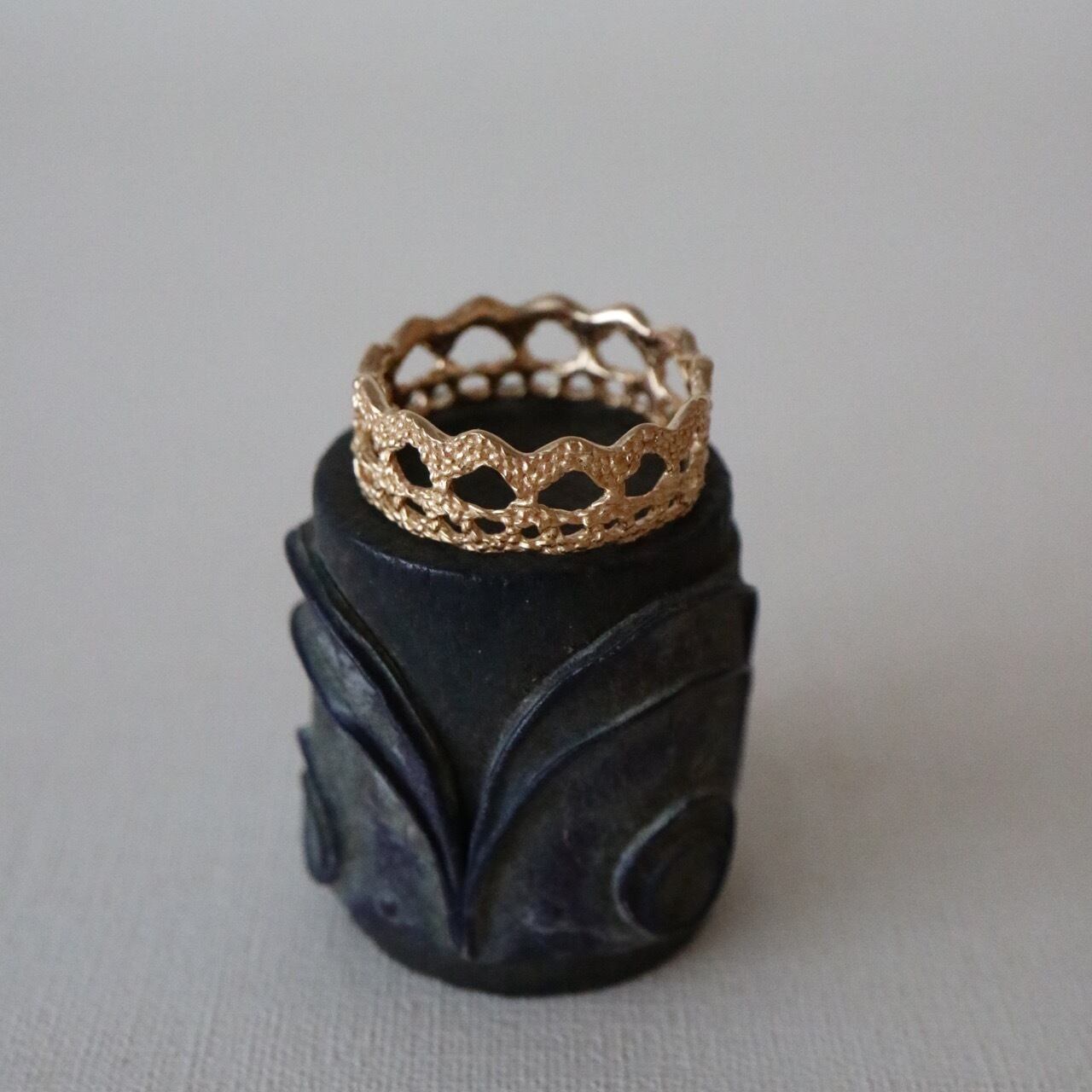 フランスのアンティークレースを「現物鋳造」という技法を用いて仕立てたリング。出来上がったジュエリーは繊細な糸目も綺麗に写し取り、シルバーなのにまるで本物のレースのよう。着け心地も軽やかです。