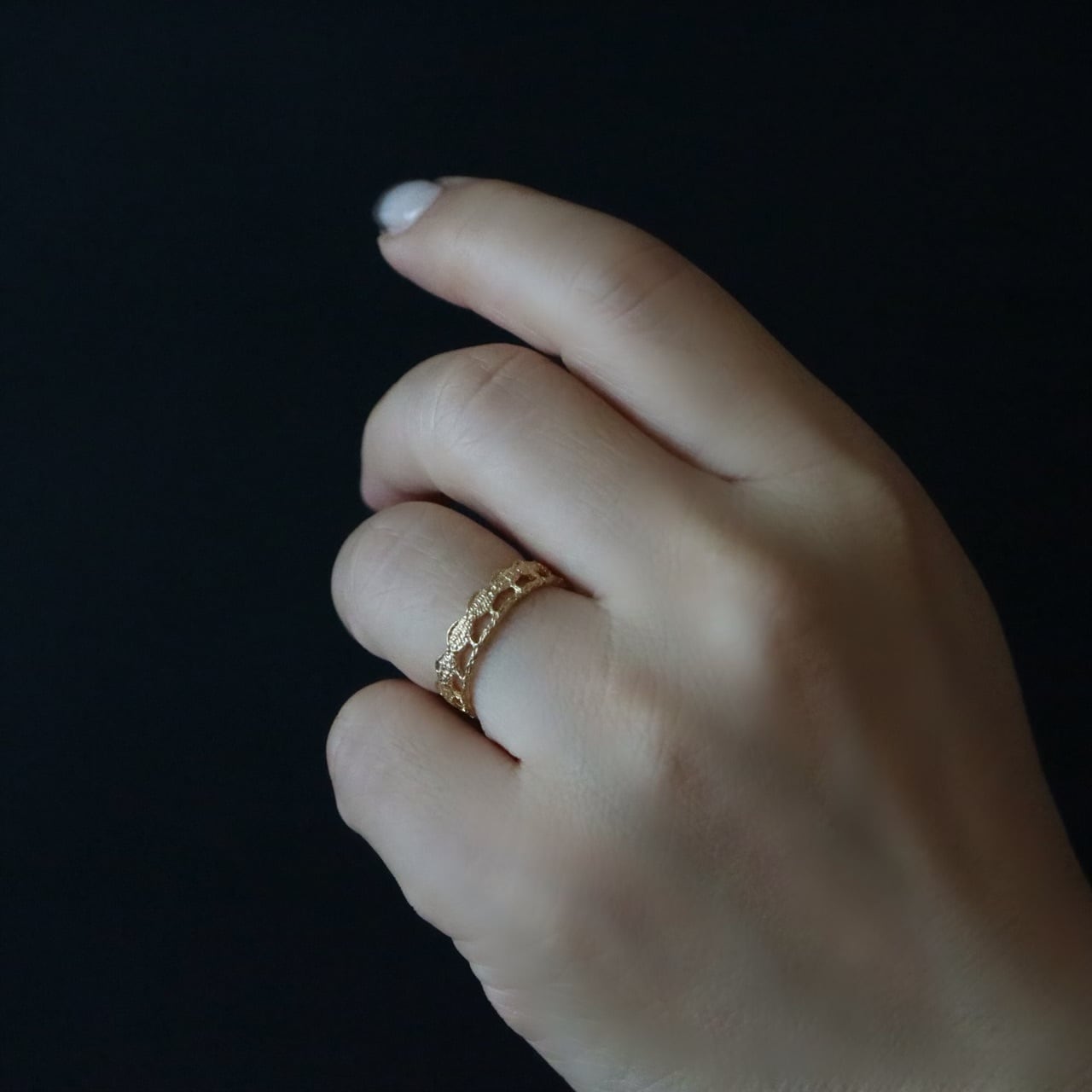 フランスのアンティークレースを「現物鋳造」という技法を用いて仕立てたリング。出来上がったリングは繊細な糸目も綺麗に写し取り、シルバーなのにまるで本物のレースのよう。着け心地も軽やかです。