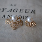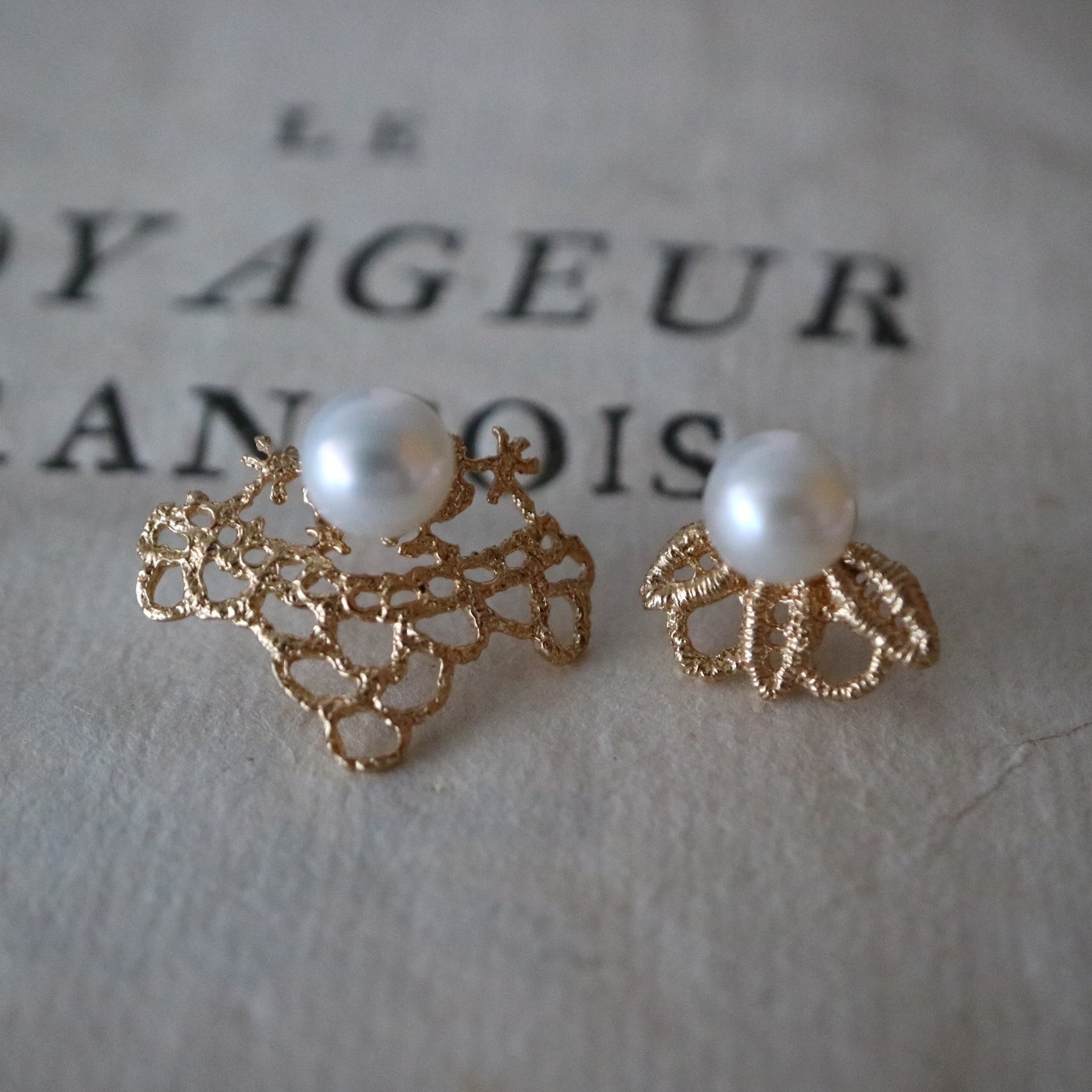 フランスのアンティークレースを「現物鋳造」という技法を用いて仕立てた片耳用のシングルピアス。パールだけでも使用出来る2WAYの仕様です。パールはテリの良い淡水の6.5~7mmを使用しているのでさりげない存在感があります。在庫が2つあるので2つご購入いただいて通常のペアのピアスとしても。
